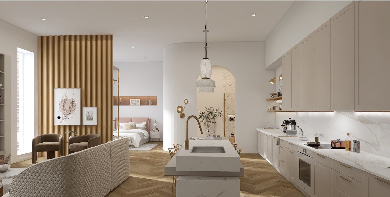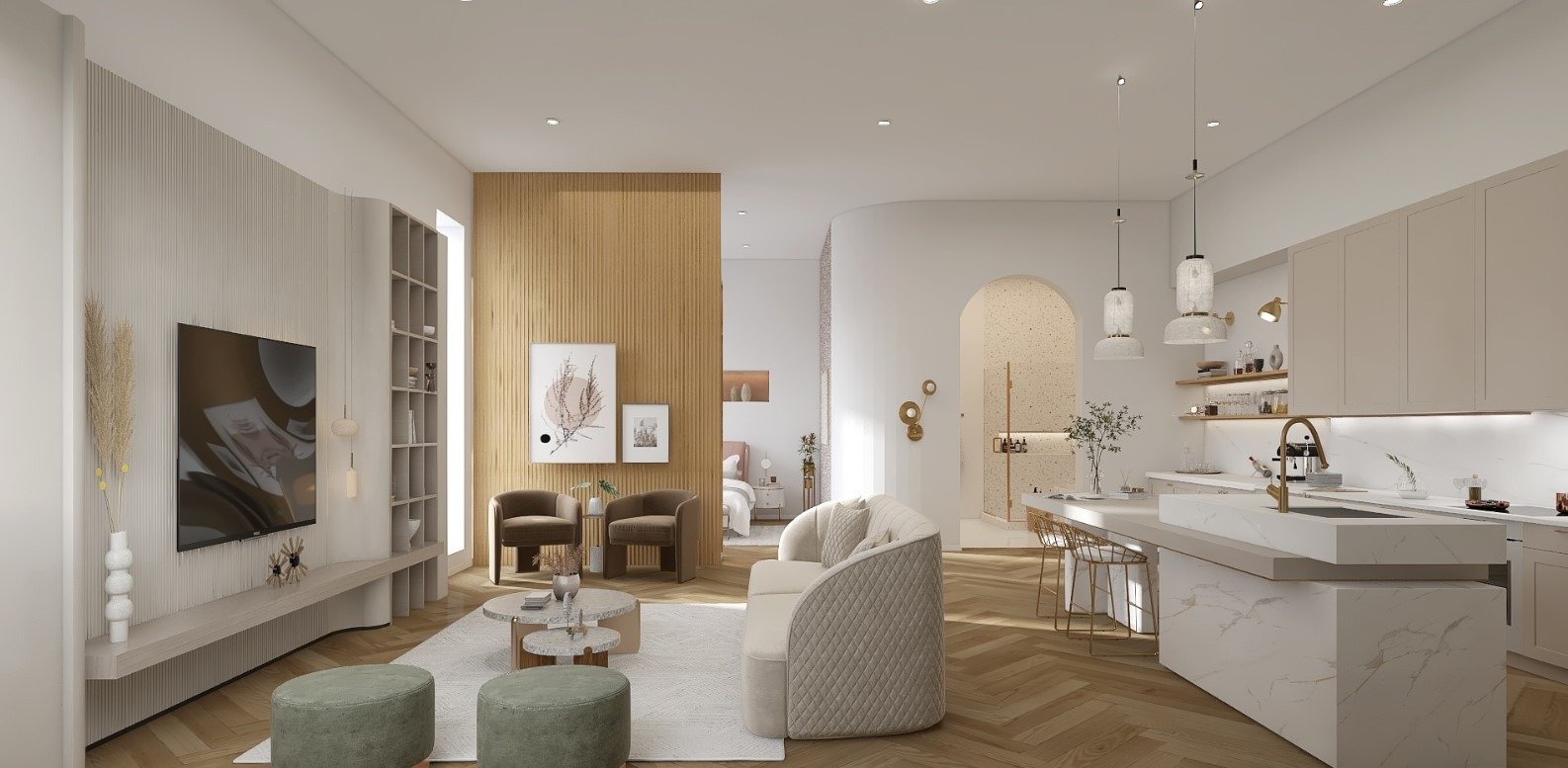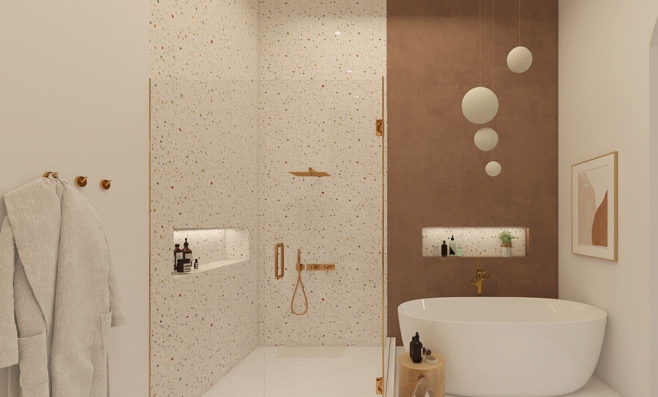 הצבעים נולדו מתוך אהבה לצבע הזהב בשילוב העץ על מנת להכניס חמימות לדירה.
