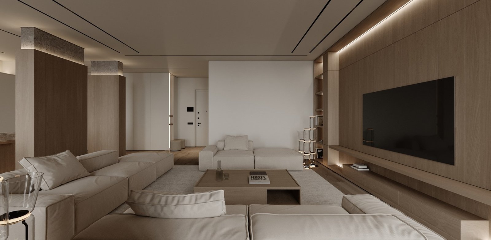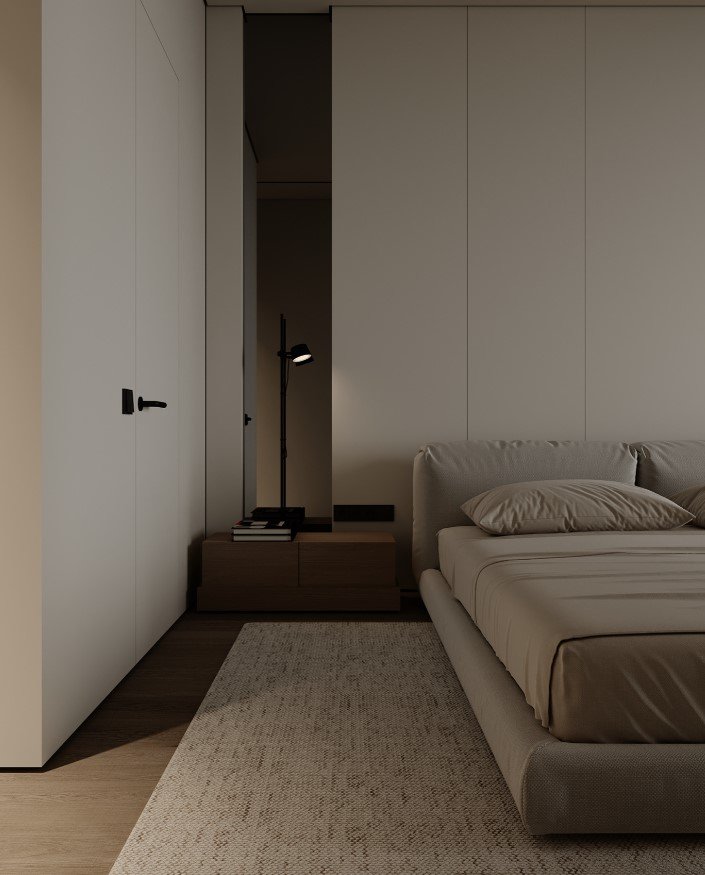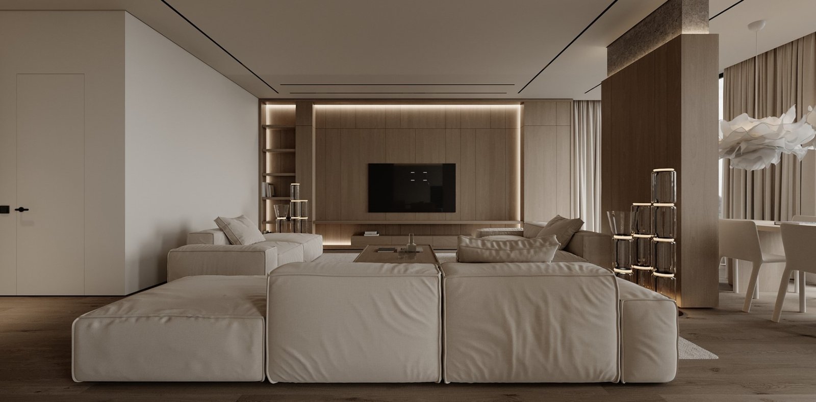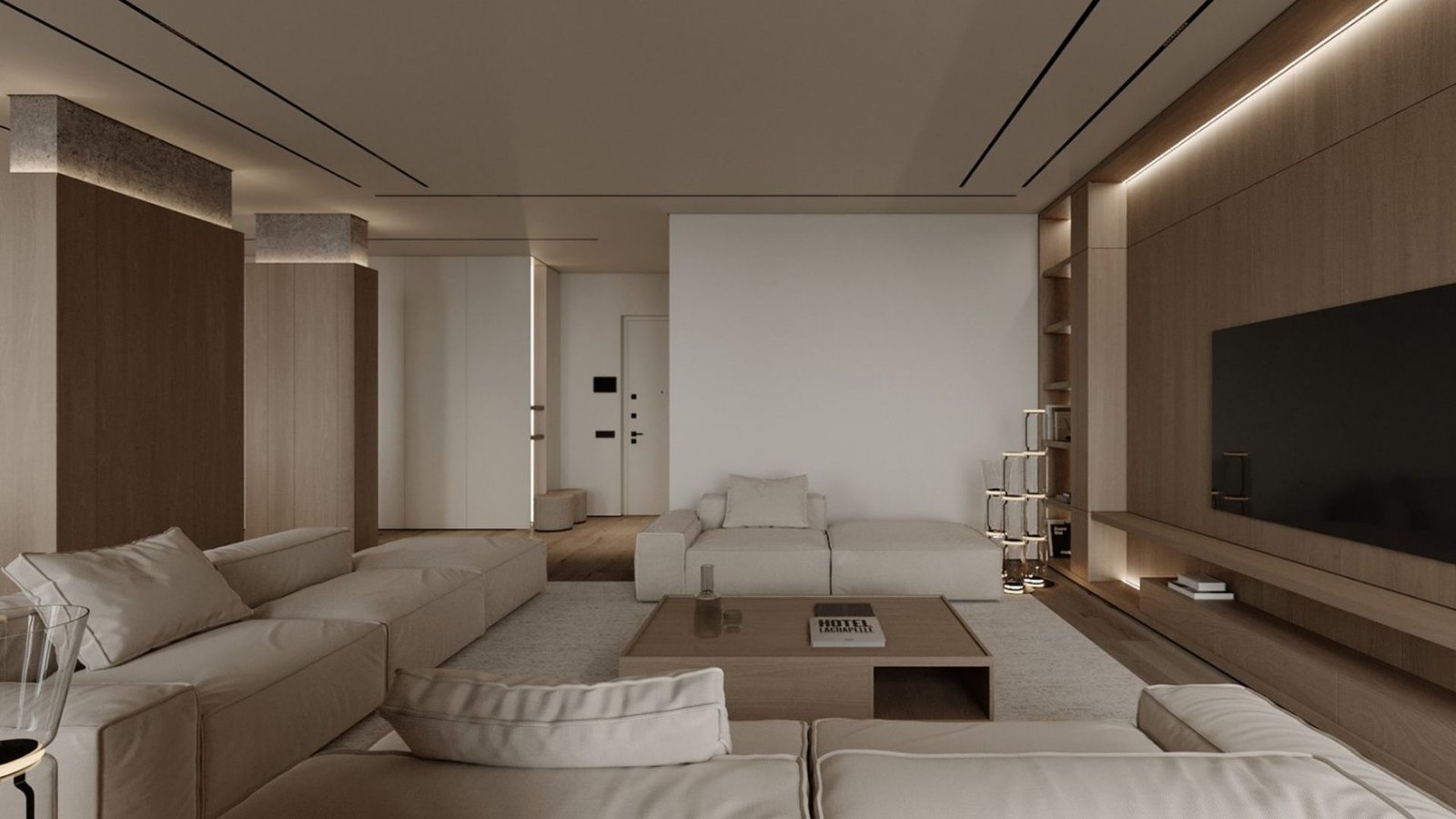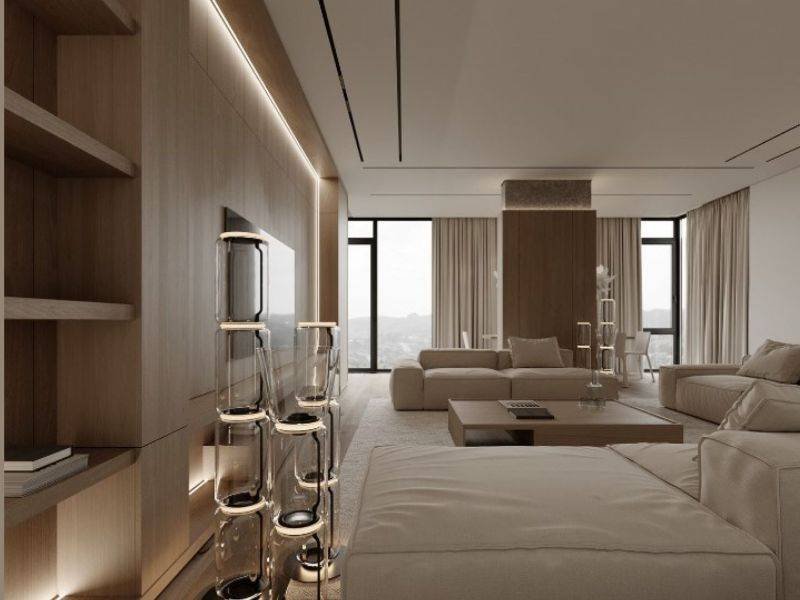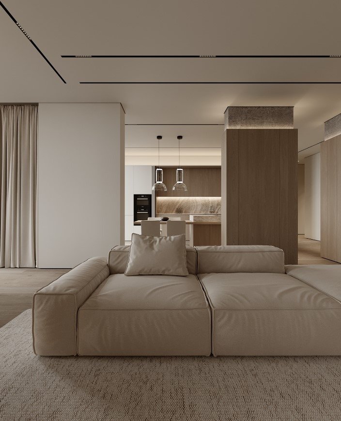 גופי התאורה נסתרים בדירה ליצירת מראה מינימלי.