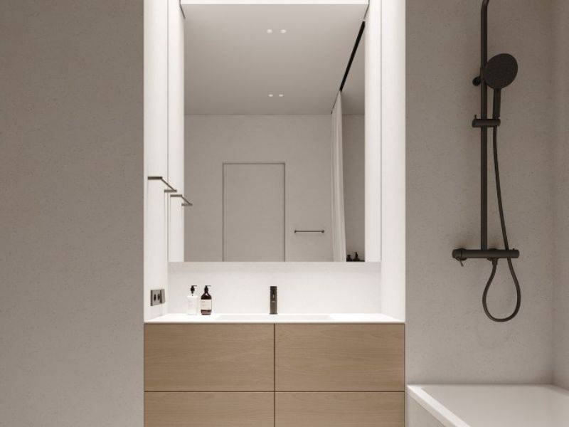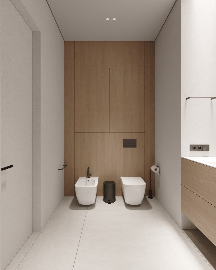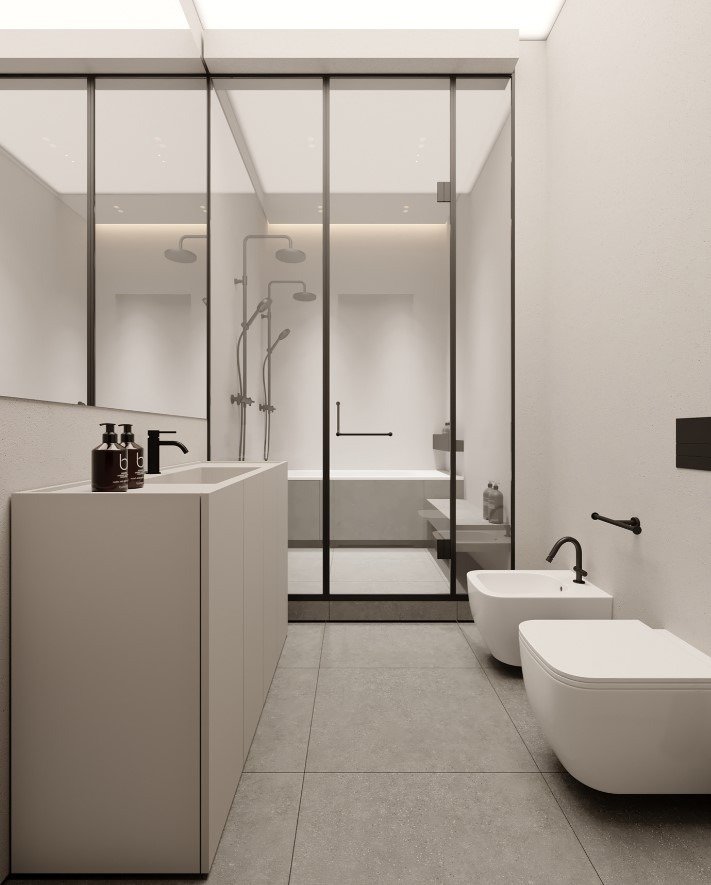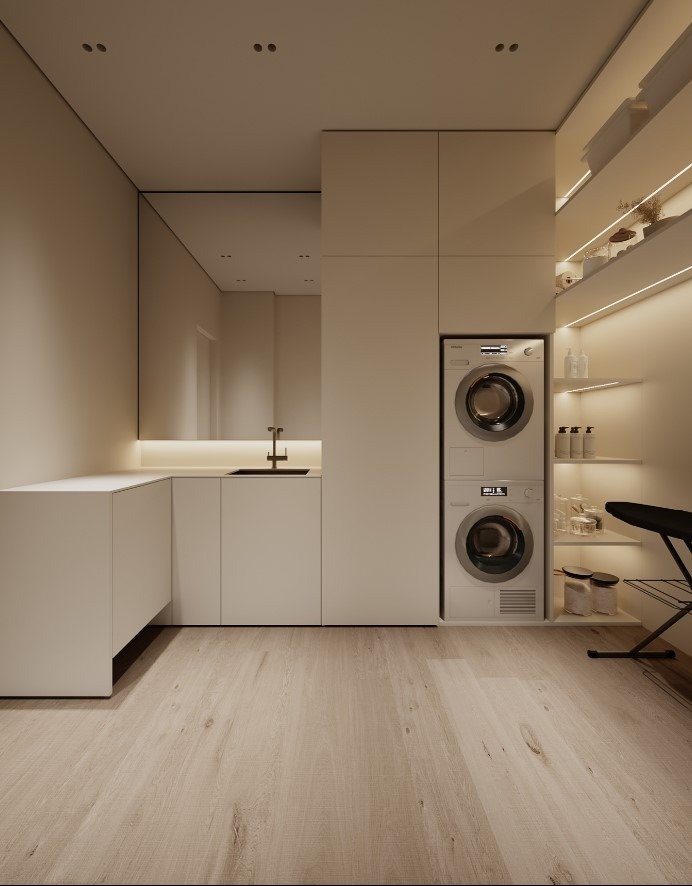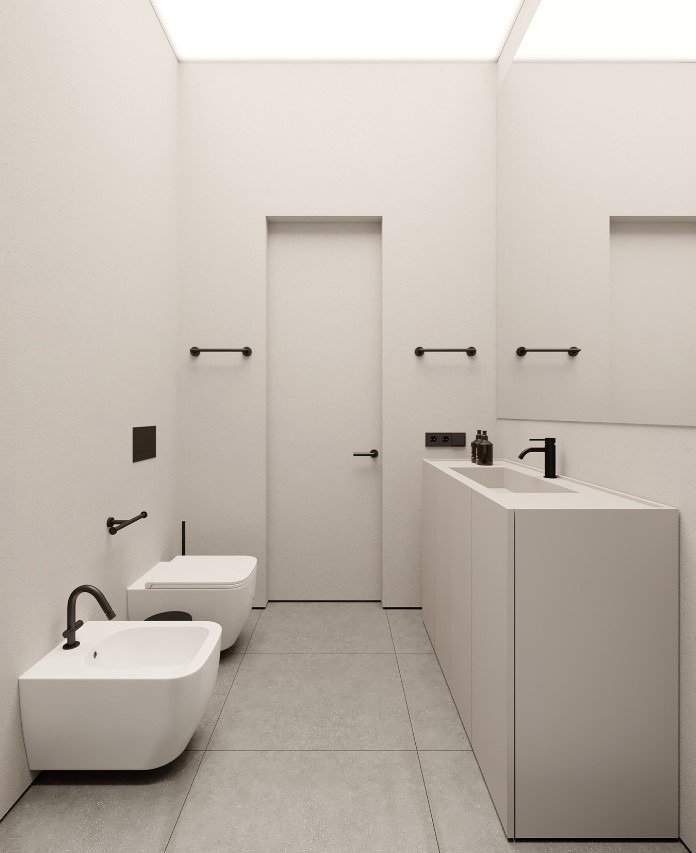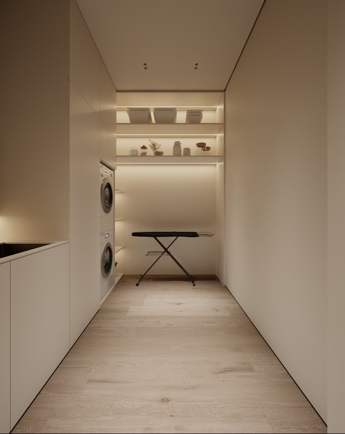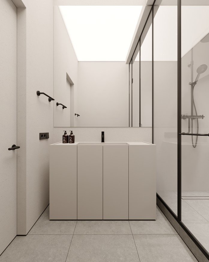 כמו גם במטבח ניתן להסתרה בעזרת דלתות כדי להמשיך את הקו המינימליסטי.