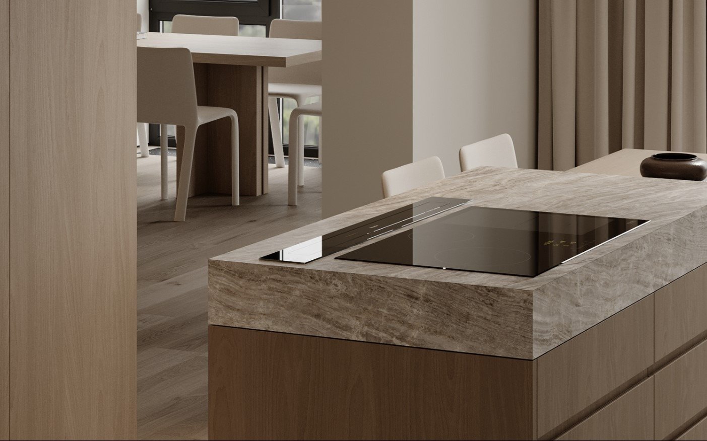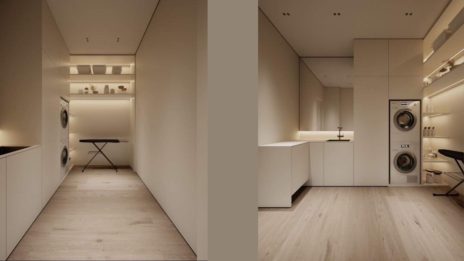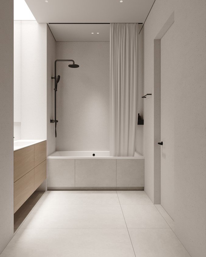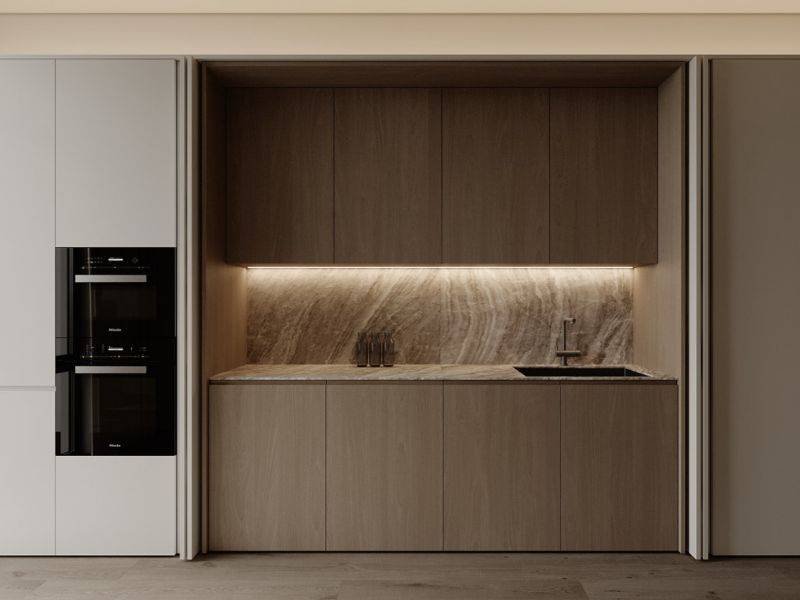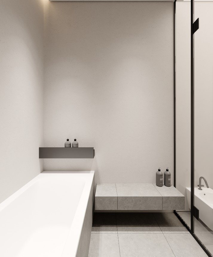 כמו גם במטבח ניתן להסתרה בעזרת דלתות כדי להמשיך את הקו המינימליסטי.